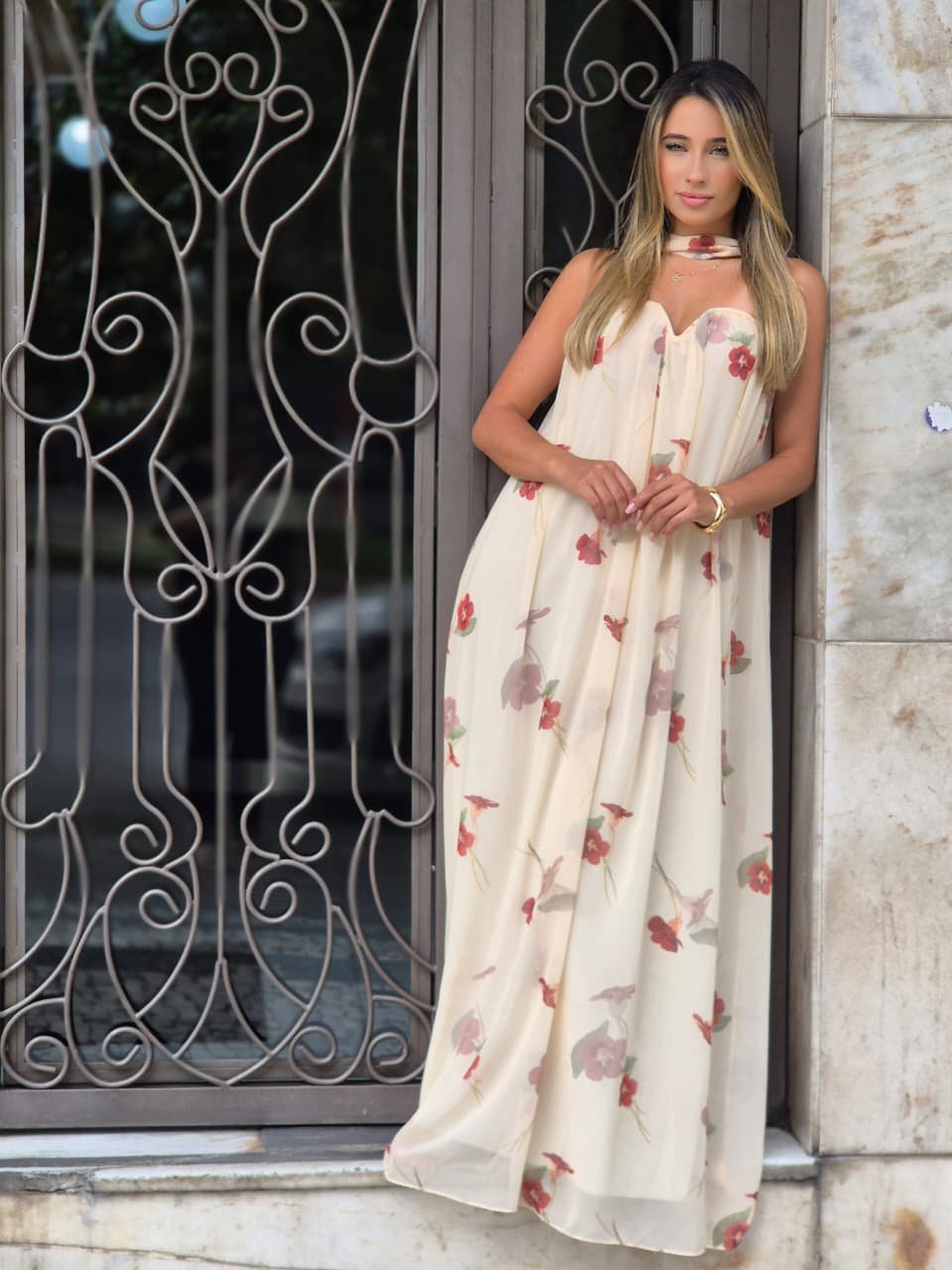 Vestido longo confeccionado em chiffon leve e fluido, com estampa floral delicada que traz feminilidade e sofisticação ao look.