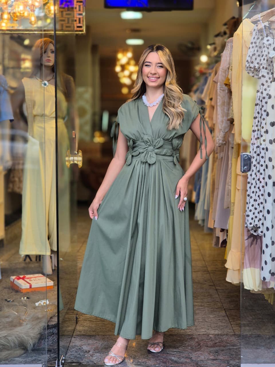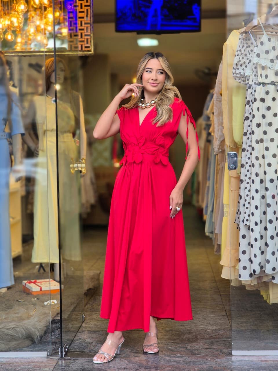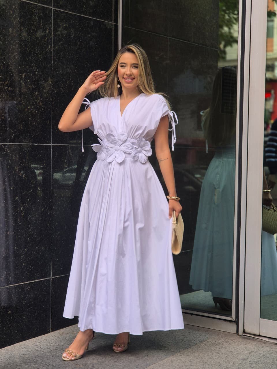 Vestido romântico com delicado detalhe de flor, ideal para composições femininas e elegantes.